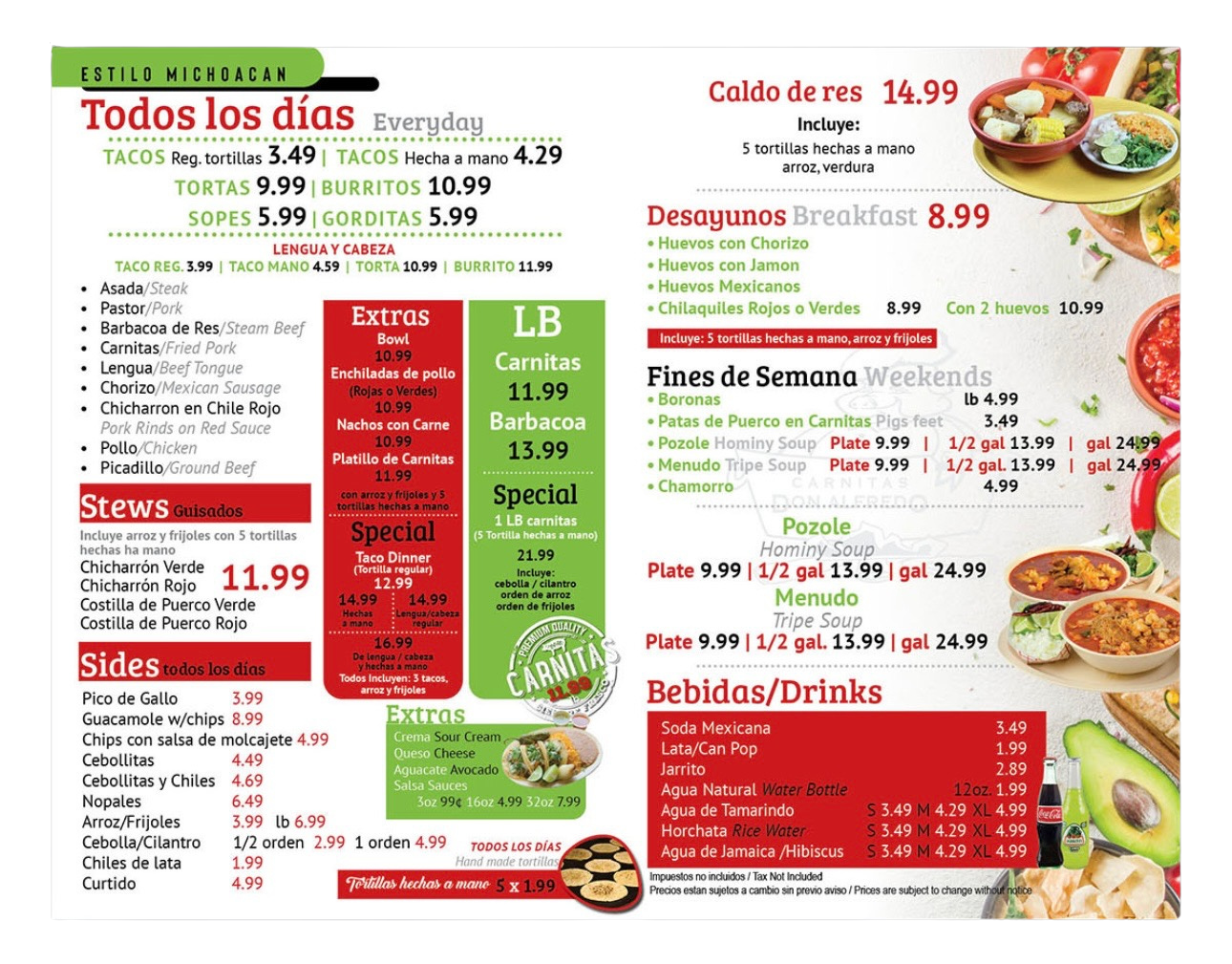 We make traditional Mexican food and soup like Pozole and Menudo. Our Carnitas and Chicharron with beans on a tortilla is simple but delicious.